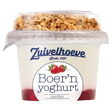Ingrediënten: YOGHURT, 10% muesli [HAVERVLOKKEN, suiker, zonnebloemolie, glucose-fructosestroop, TARWEVLOKKEN, kokos, HAZELNOOT, rijstebloem, TARWEMOUT, TARWEMEEL, TARWEGLUTEN, dextrose, invertsuiker, zout, GERSTEMOUT, melasse, antioxidant (tocoferolrijk extract)], suiker, 4,2% aardbei, 1,4% aardbeipuree uit concentraat, MELKEIWIT, 1,2% aardbeiensap, rijstzetmeel, verdikkingsmiddelen (pectinen, guarpitmeel), wortelconcentraat, citroensapconcentraat, natuurlijk aroma.