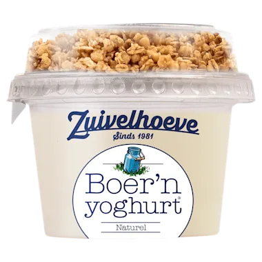 Ingrediënten: YOGHURT, 10% muesli [HAVERVLOKKEN, suiker, zonnebloemolie, glucose-fructosestroop, TARWEVLOKKEN, kokos, HAZELNOOT, rijstebloem, TARWEMOUT, TARWEMEEL, TARWEGLUTEN, dextrose, invertsuiker, zout, GERSTEMOUT, melasse, antioxidant (tocoferolrijk extract)], MELKEIWIT.
