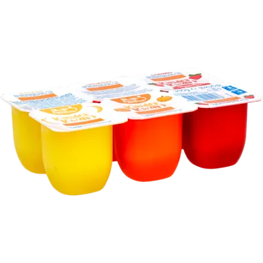 Kwark met suiker en fruit (abrikoos, aardbei, banaan), met toegevoegd calcium en vitamine D