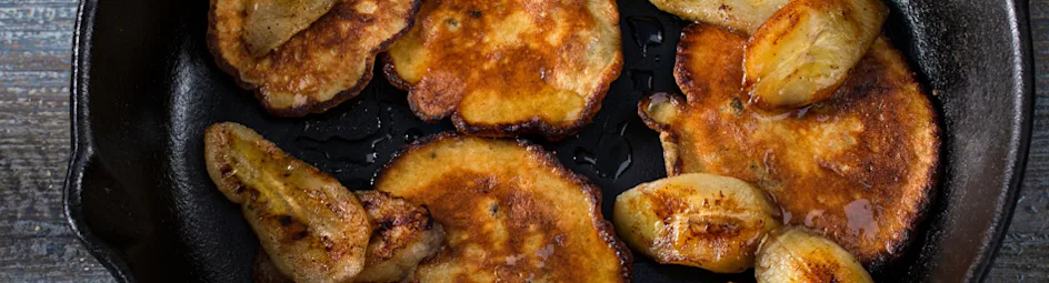 Snijd de resterende banaan in dunne plakjes. Verhit telkens een beetje van de boter in de pan en schep er drie hoopjes beslag in van ca. 10 cm. Verdeel de plakjes banaan over het beslag.