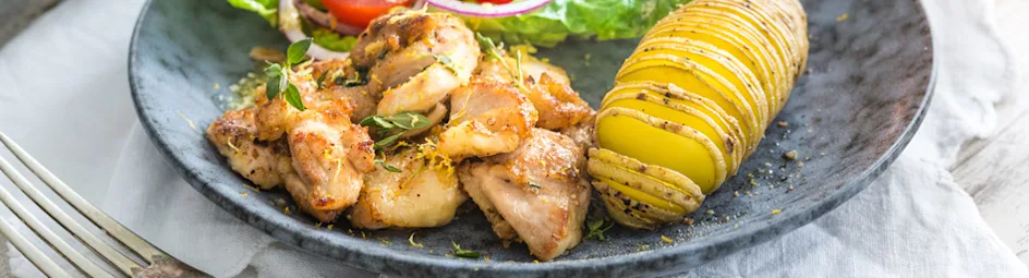 Meng de olijfolie extra vierge door de mosterd en meng door de salade. Breng op smaak met een beetje zout en versgemalen peper. Schep de salade en de kip op bord en zet er een hasselback aardappel bij.