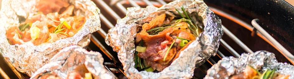 Leg de pakketjes 15 minuten op de barbecue en gril tot de aardappelen gaar zijn.