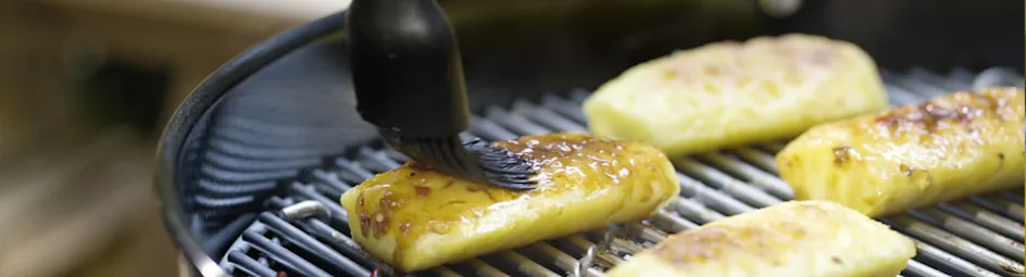 Gril de ananas 5 minuten aan de buitenkant van het rooster. Smeer de ananas met behulp van een kwastje met de glazé in en gril deze opnieuw 5 minuten.
