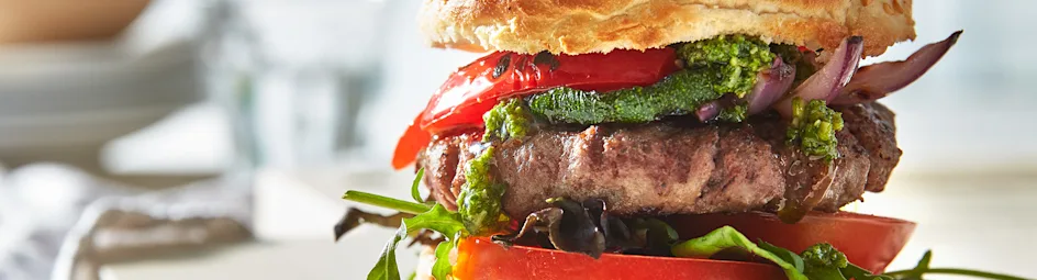 Beleg de onderste helften van de broodjes met de slamelange en de tomaat. Leg er de Angusburgers op. Garneer de burgers met de pesto en wat gegrilde groenten. Dek af met de bovenste helften van de broodjes. Serveer de rest van de gegrilde groenten apart bij de burgers.
