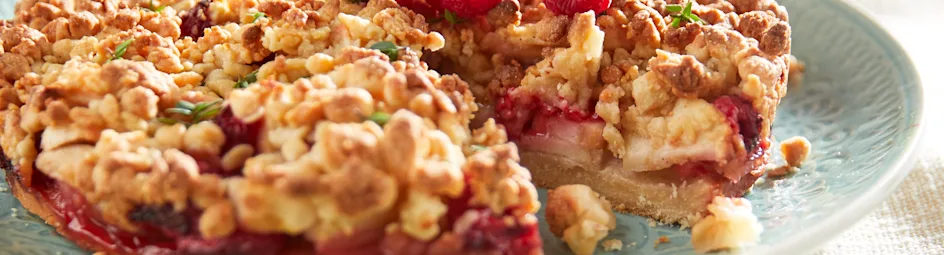 Druk tweederde van het deeg uit op de bodem van de springvorm. Verdeel het appel-frambozenmengsel over de deegbodem. Verkruimel de rest van het deeg tussen de vingers boven de taart.