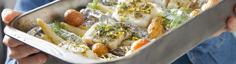 Aspergepakketjes met kabeljauwhaas en citroenkrieltjes
