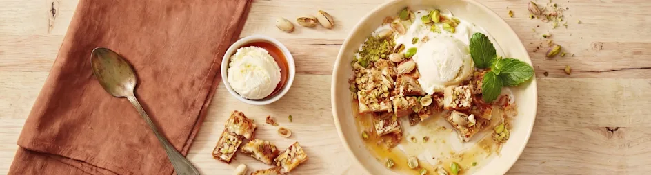 Baklava IJscoupe met honing en pistache