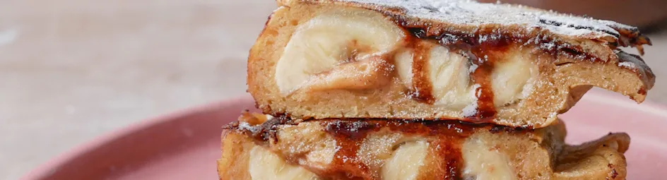 4. Leg de banaan erop en lepel hier vervolgens de rest van het beslag overheen. Bak langzaam aan en draai dan heel voorzichtig met twee spatels om.
