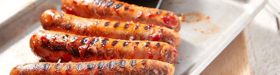 Rooster de worsten op de hete barbecue in 10 min. bruin en gaar. Serveer ze met de rest van de barbecue-gembersaus en de koolsalade.