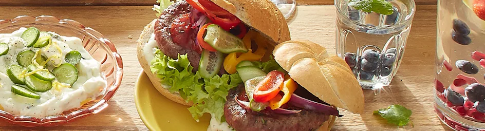 Tijdens het barbecueën is hij niet te missen, het broodje hamburger natuurlijk. Dit is een variant met een heerlijke truffeldressing, rode ui, een paprikamix en komkommers om het af te maken. Probeer hem nu en laat het je smaken!