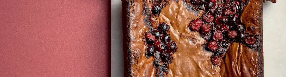 Schenk het beslag in de vorm en verdeel de cranberry’s in stervorm erover. Bak de brownie in de voorverwarmde oven 30 min, tot de bovenkant net stevig en krokant is. De binnenzijde is dan nog zacht en smeuïg.