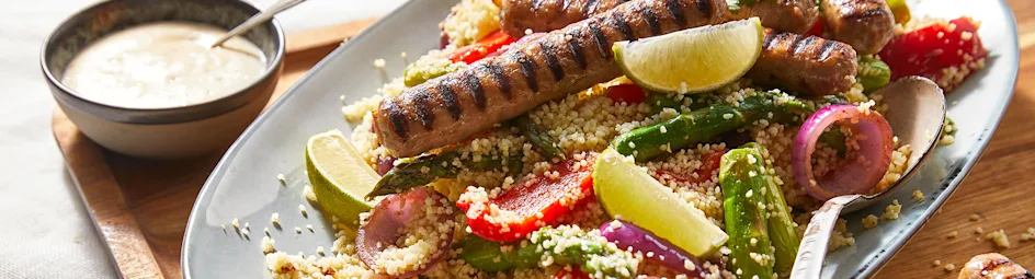 Laat de couscous afkoelen tot kamertemperatuur voor de couscoussalade met gegrilde groenten. Liever vega? Neem vegan chipolataworstjes.