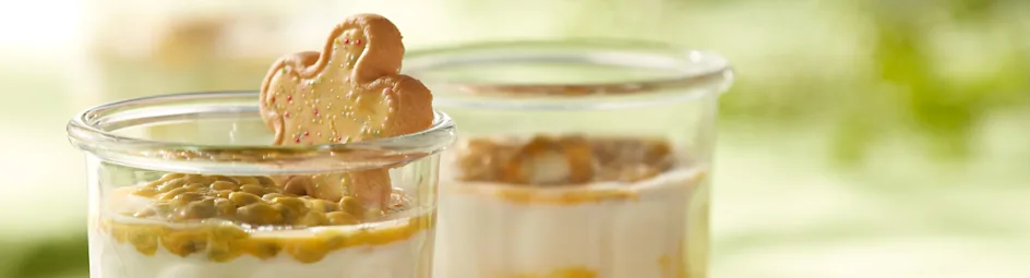 Halveer de passievruchten. Schep met een lepel het vruchtvlees uit de passievruchten op de yoghurt.