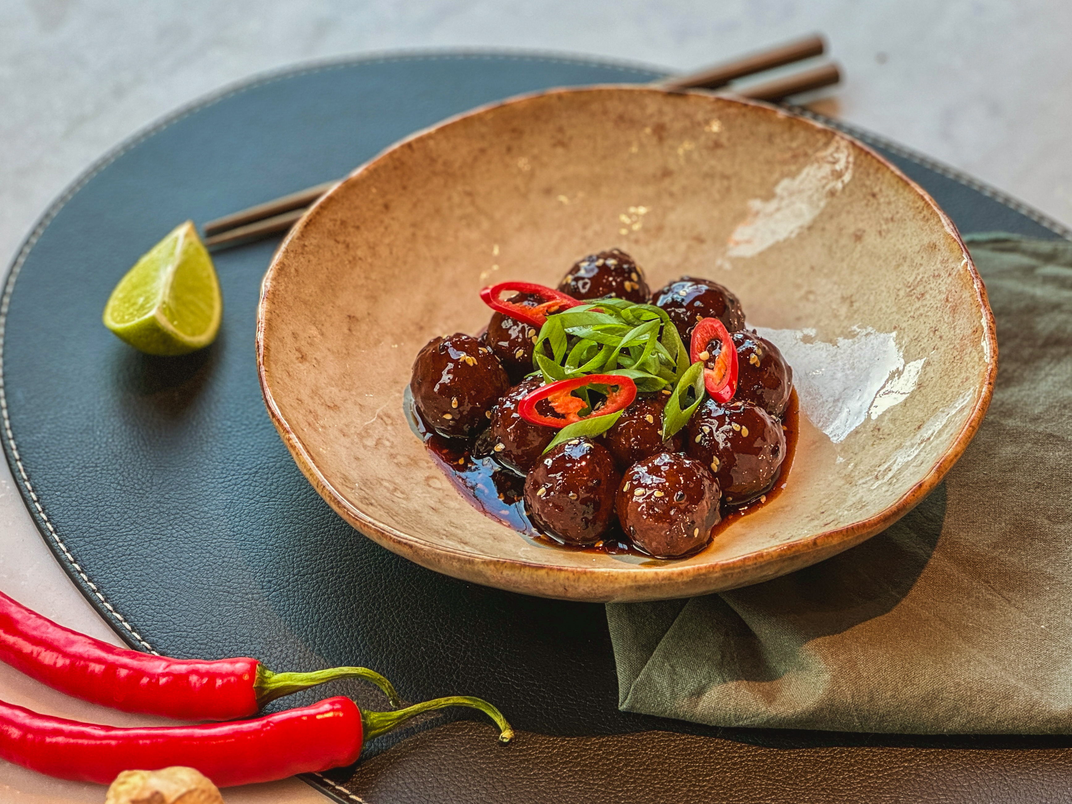 3. Bak de gehaktballen rondom goudbruin. Voeg de saus toe en verwarm kort door, zodat de saus aan de ballen blijft plakken en ze een mooie laklaag krijgen.