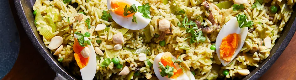 Liever met een beetje vlees of vis? Schep met de peterselie 150 g hamreepjes of 100 g gerookte zalmblokjes door de rijst. Gebruik eventueel 2 eieren minder.