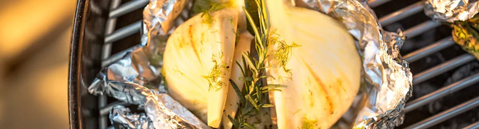 Stoom de venkel-courgette pakketjes in 15-20 minuten gaar op de barbecue en serveer de pakketjes met een schijfje citroen.