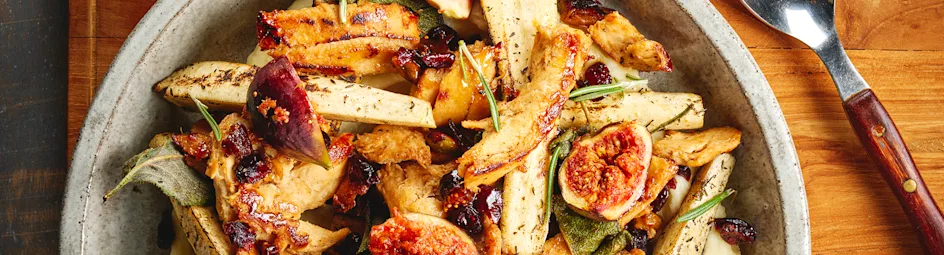 Geroosterde plantaardige kipstukjes met pastinaak en verse vijgen