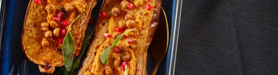 Rooster de pompoen en kikkererwten een dag eerder, zodat ze alleen nog in de oven hoeven te worden verwarmd (160 °C, 10-15 min.). Garneer eventueel met granaatappelpitjes. Neem hummus naturel (bakje 200 g) voor een mildere smaak.