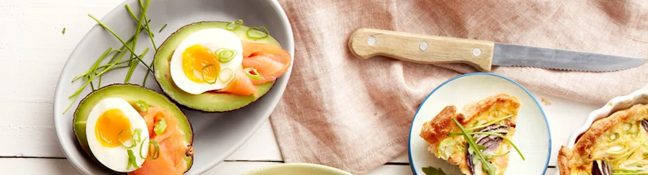 Gevulde avocado’s met een zachtgekookt ei, Noorse zalm en lente-ui