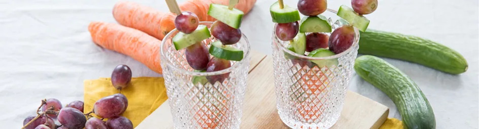 Was de snackkomkommers en de rest van het fruit of de groente, indien nodig. Snijd 24 plakjes van de komkommers. Snijd de plakjes doormidden.