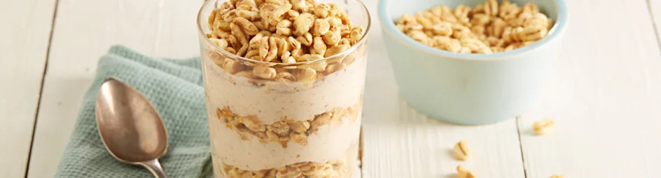 Meng in een groot glas de yoghurt met de banaan, suiker en pindakaas.