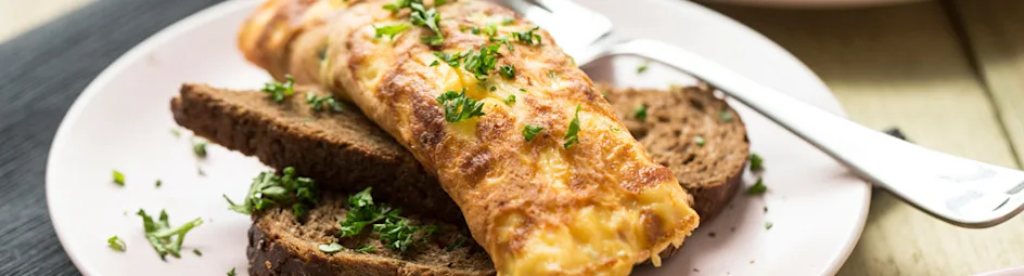 Laat de omelet uit de pan glijden en rol deze op. Herhaal deze stappen nog drie keer en garneer de ham-kaas omelet-rolletjes met verse peterselie en een sneetje brood.