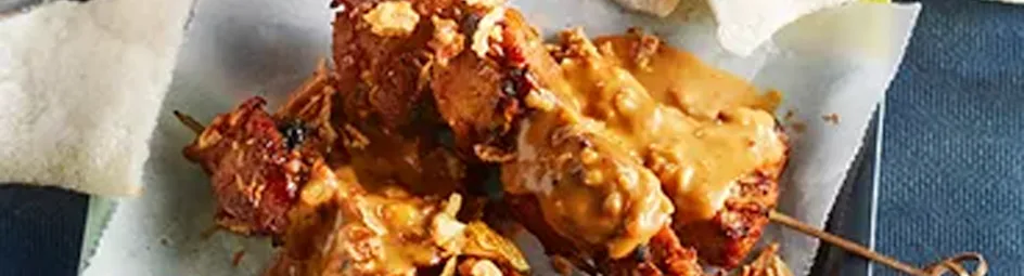 6. Serveer de satéstokjes met de rijst, kroepoek en satésaus. Lekker met atjar tjampoer en gefrituurde uitjes.