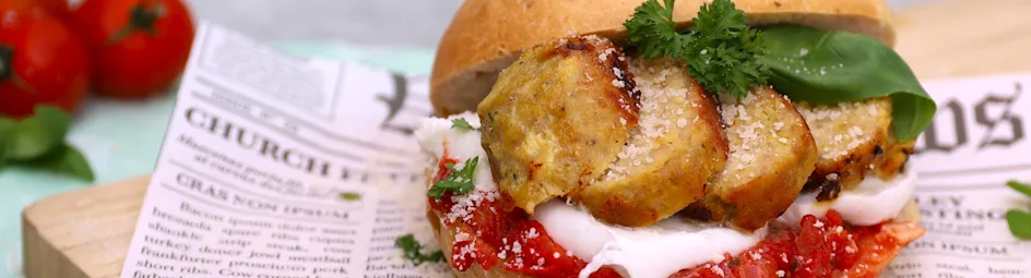 5. Beleg het broodje met tomatensaus, de kipgehaktbal, mozzarella, getopt met Parmezaanse kaas en basilicum