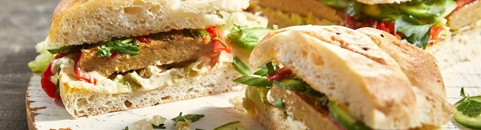 Liever zonder vlees? Gril vegan gemarineerde kipfilet op de barbecue. Snijd in reepjes en verdeel over de ijsbergsla.