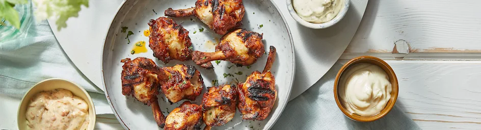 Leg de kipkluifjes op een tapasschaaltje, garneer met peterselie en serveer met het aioli-trio.