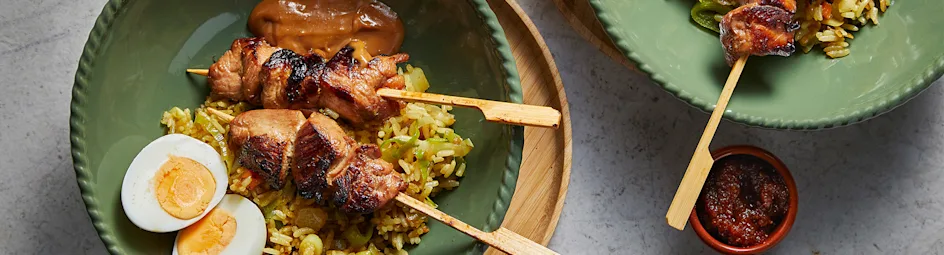 Schep de nasi op 4 borden. Leg de kipsaté en partjes ei erbij. Schep de satésaus over de kipsaté.