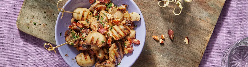 Schep de champignons in een tapasschaaltje. Bestrooi met de amandelen, peterselie en peper en zout naar smaak.