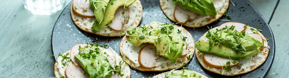Matzes met avocado, gerookte kip en tuinkers