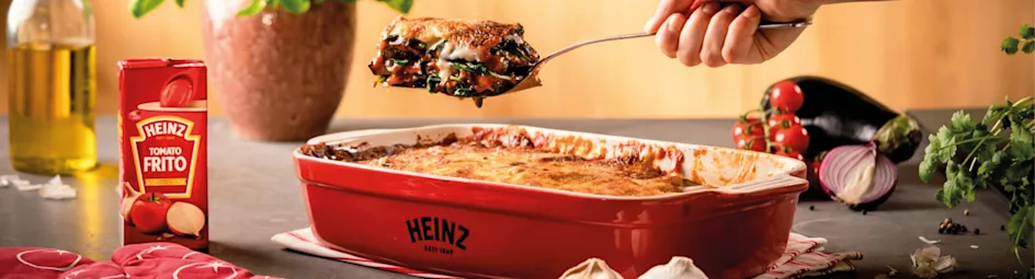 4. Vet een braadpan in, beleg met een enkele laag aubergineplakken, voeg vervolgens ¼ van de Heinz Tomato Frito en ¼ van de spinazie toe. Herhaal dit en eindig met aubergineplakken. Schep de bechamelsaus