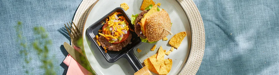 Beleg 1 afgebakken brunchbroodje (mix, Feestelijk PLUS) met 2 blaadjes botersla (koelvers), 1 plakje trostomaat** en 1 tl aioli of guacamole. Leg er de miniburger, ½ el gesneden rode ui (koelvers), 1 el geraspte cheddarkaas (stukje 100 g) en 2 tortillachips** op.