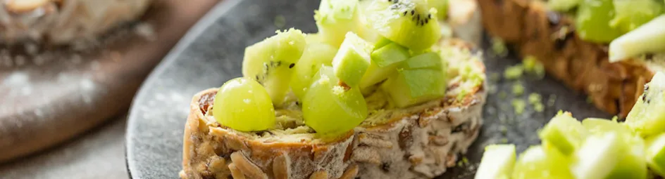 Serveer de notenstol samen met de verse fruitsalade over 4 ontbijtborden.
