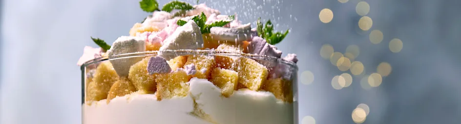Verdeel de cake over de roomkwark. Garneer met de (gebroken) kransjes, de poedersuiker en blaadjes munt.