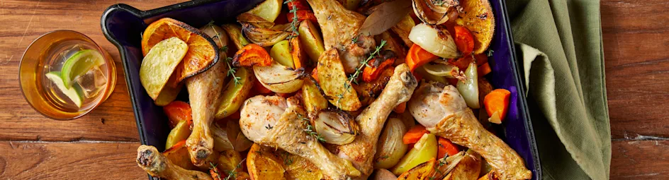 Ovenschotel van drumsticks met sinaasappel, aardappel en winterpeen