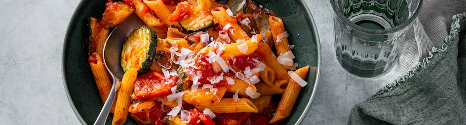 Voeg de bevroren gegrilde groenten toe en schep deze door de saus. Laat afgedekt nog circa 10 minuten pruttelen. Schep halverwege door. Kook intussen de pasta beetgaar.