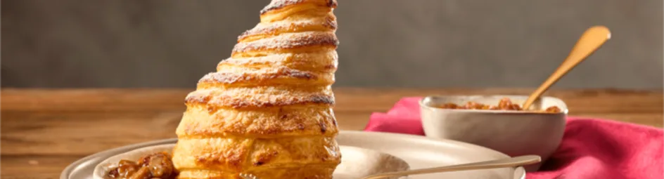 Verwarm ondertussen de oven voor op 200 ºC. Bestrijk de peren met de siroop. Omwikkel elke peer van onder tot boven met een reep bladerdeeg en houd aan de bovenkant een stukje over.