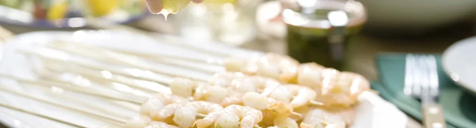 Rijg de garnalen aan de satéprikkers en gril 2-3 minuten op de barbecue aan beide kanten.