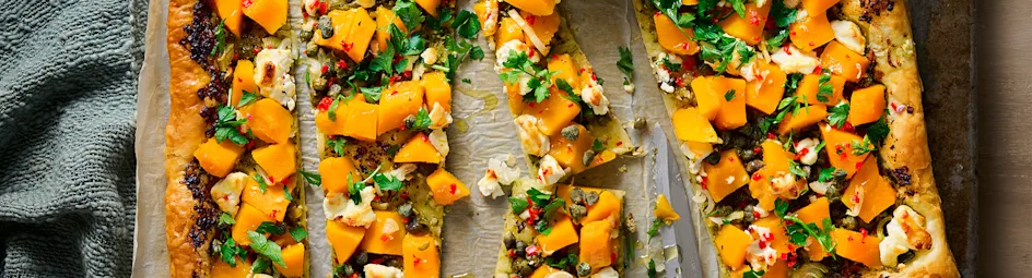 Verwarm de oven voor op 200ºC. Stoom of kook de pompoenblokjes in circa 8 minuten gaar. Rol het bladerdeeg uit op de bakplaat, of plak de plakjes bladerdeeg net iets overlappend op elkaar. Bestrijk tot 2 cm van de randen met de pesto.