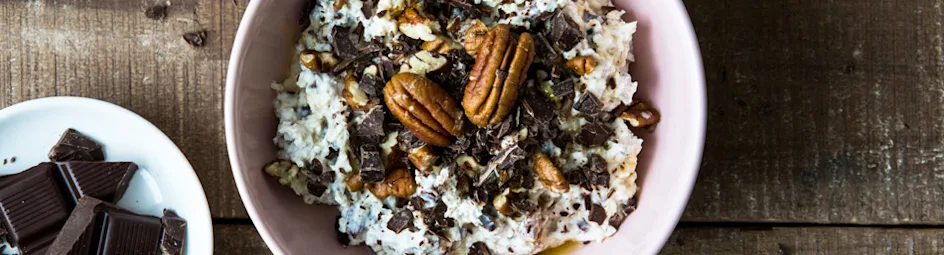 Snijd de pure chocolade in kleine stukjes en hak de pecannoten grof. Meng het havermoutmengsel door de kwark, voeg de pure chocolade, de honing en de pecannoten toe en roer goed door.