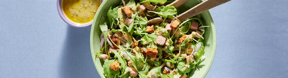Salade met rucola, honingpaté, kappertjesvinaigrette en koekcroutons