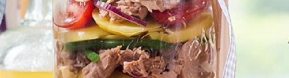 Bouw de salade in laagjes op in de pot. Wij kozen voor deze volgorde: aardappel, tomaat, basilicum, haricoverts, ei en als laatste tonijn.