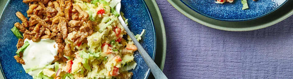 Kook de aardappelen in water met zout in 20 min. gaar. Verhit de olijfolie in een koekenpan. Bak de shoarma in 8-10 min. lichtbruin en gaar.