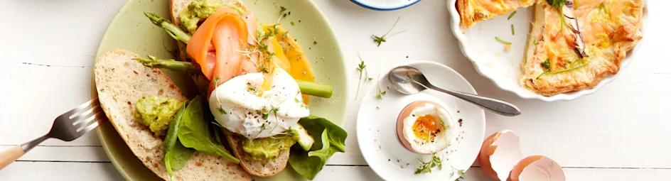 Speltbroodje zalm met gepocheerd ei, groene asperges en guacamole