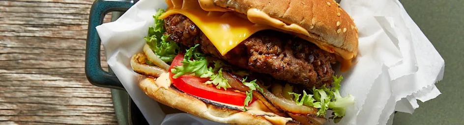 Leg op elke burger in de pan een plak kaas, zodat deze iets smelt. Beleg de broodjes met de burgers met de kaas. Verdeel de sla, tomaat en gebakken ui erover. Dek af met de bovenste helften van de broodjes.
