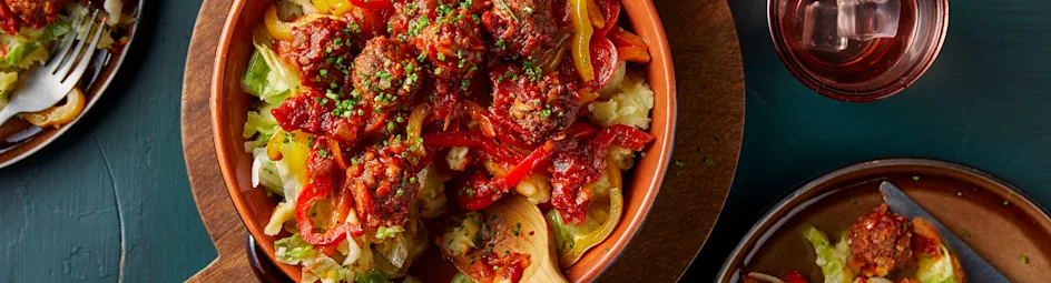 Neem in plaats van de vegan balletjes ook eens feta. Gebruik dan 2 eetlepels olijfolie. Bestrooi de stamppot met 200 gr verbrokkelde feta en verdeel er 4 eetlepels tacosaus over.