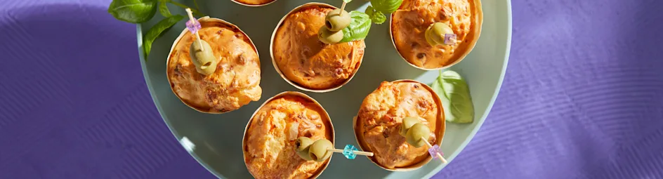 Laat de muffins 5 min. afkoelen alvorens ze op een schaal te plaatsen. Rijg aan elke prikker 2 olijven. Steek de olijvenprikkers in de muffins.
